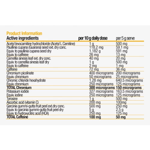 Caffeine (Caffeine anhydrous, green tea & guarana). Increase mental alertness and wakefulness. Reduce mental fatigue.